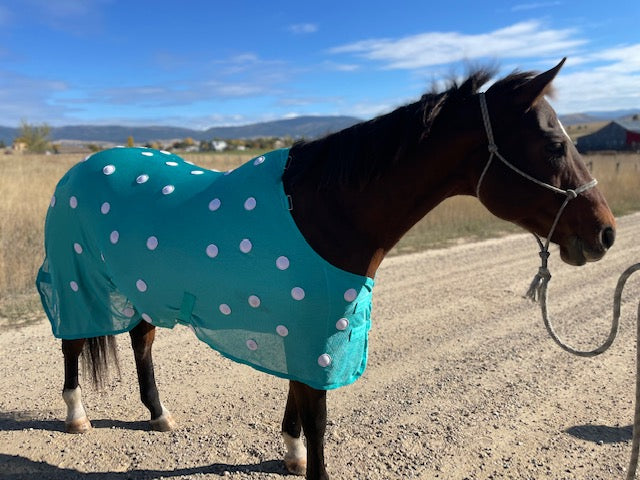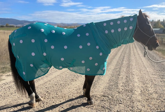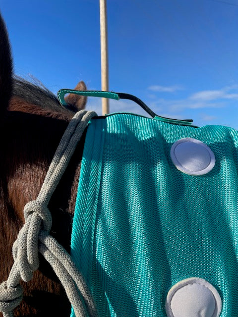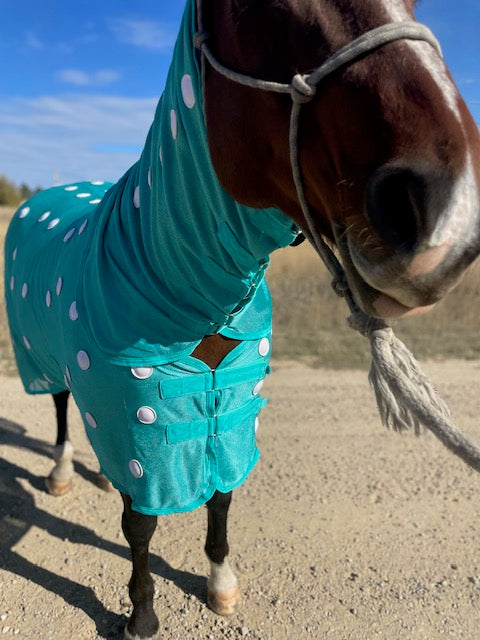 Our Blankets come with a detachable hood. The hood and chest have a Velcro hook and loop closure, halter poll loop, leg straps and crossed surcingle belly straps.